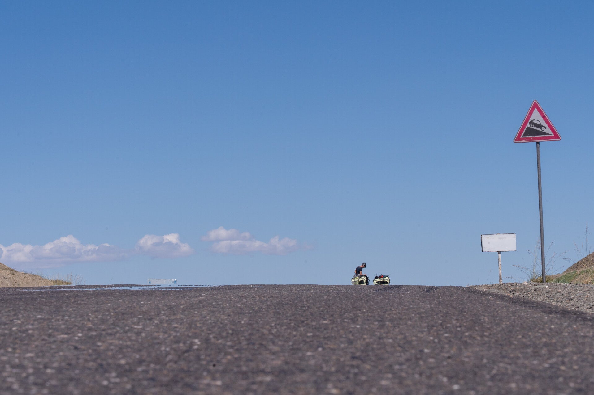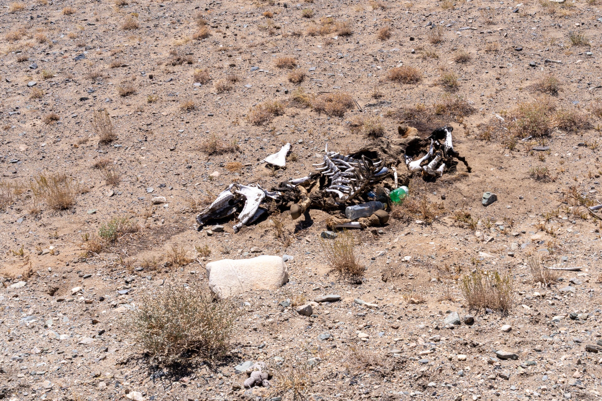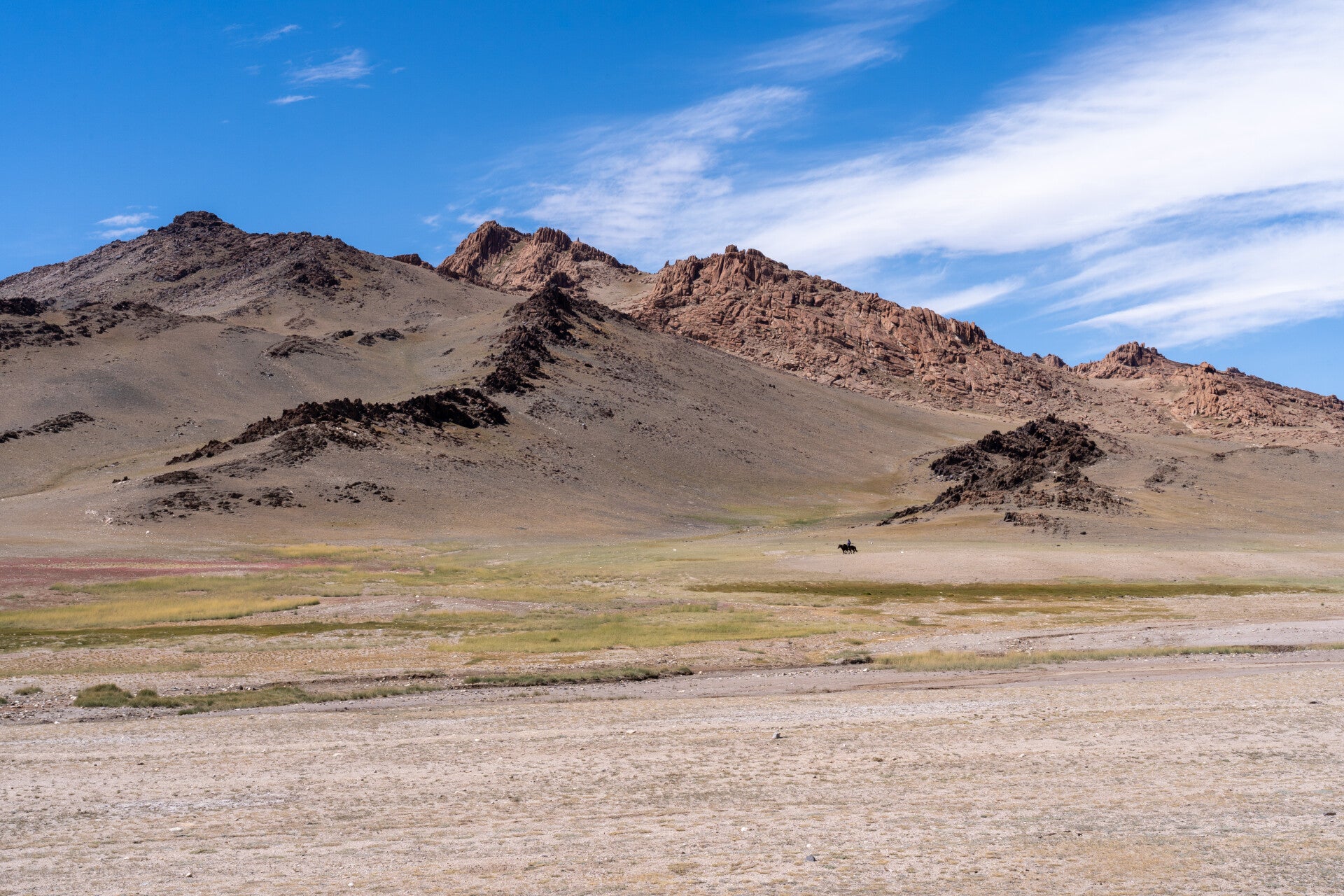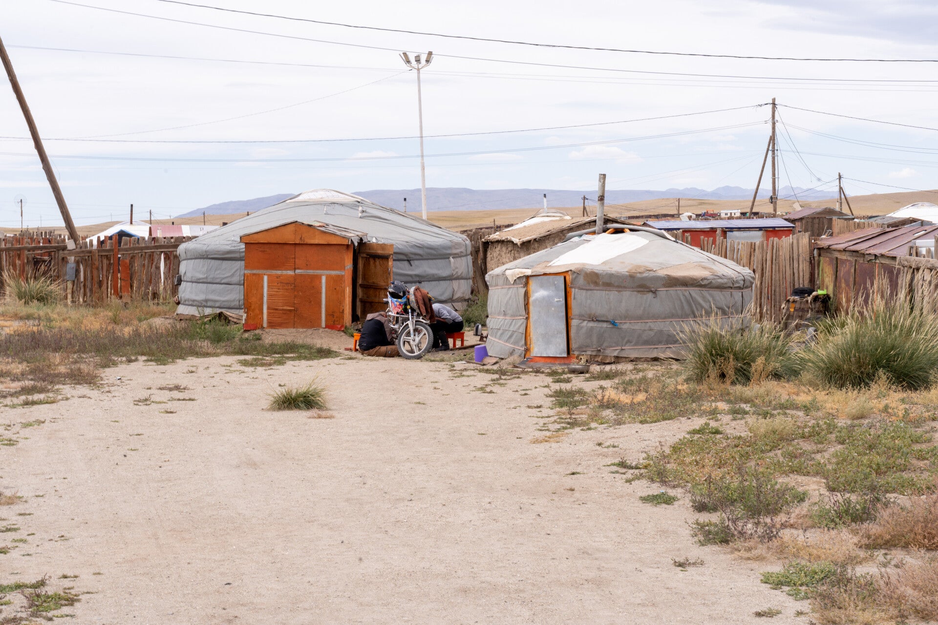 And yes, the distances are huge. We cycle more than 1,000 kilometres through endless countryside. In the west, high mountains and desert. We sometimes carry water and food for three days. We see more dead than living animals. On the way, we occasionally pass a village, where we can stock up again. The houses have corrugated iron roofs in many different shades, providing a colourful contrast to the landscape. Next to the stone house are often 2 yurts, for family visits, or for summer living. There is no sewerage, as the wooden toilet hut is in a corner of the plot. And everyone has wooden fences of dark brown boards. Towards the east, the landscape becomes more rolling. But virtually nothing grows. The Mongolian people are friendly, not honking but flashing their lights and waving. We are spoilt with watermelons.