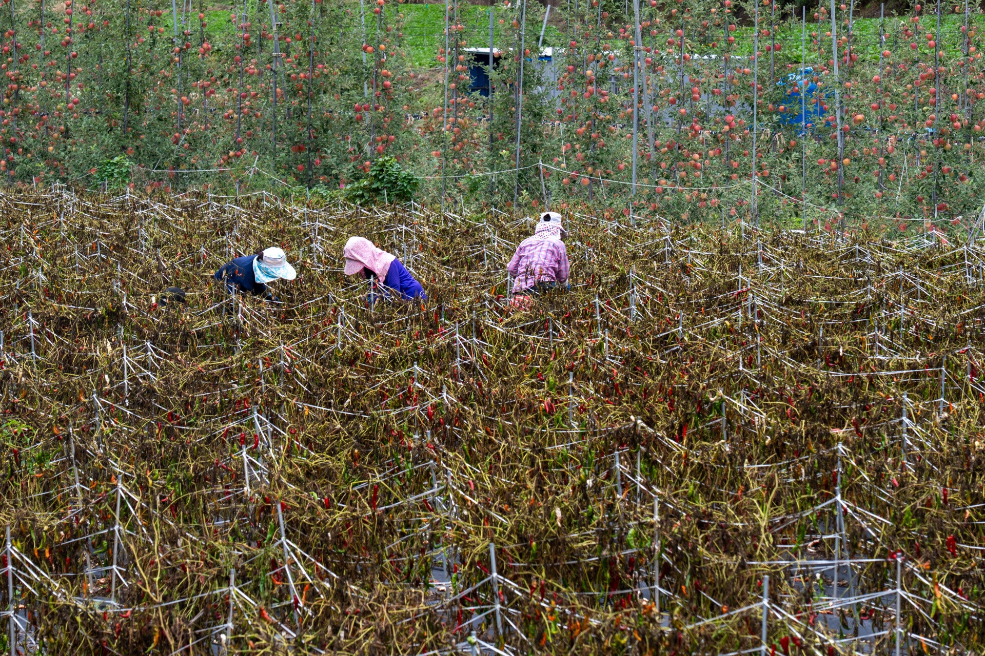 old people are bent over double from picking peppers
