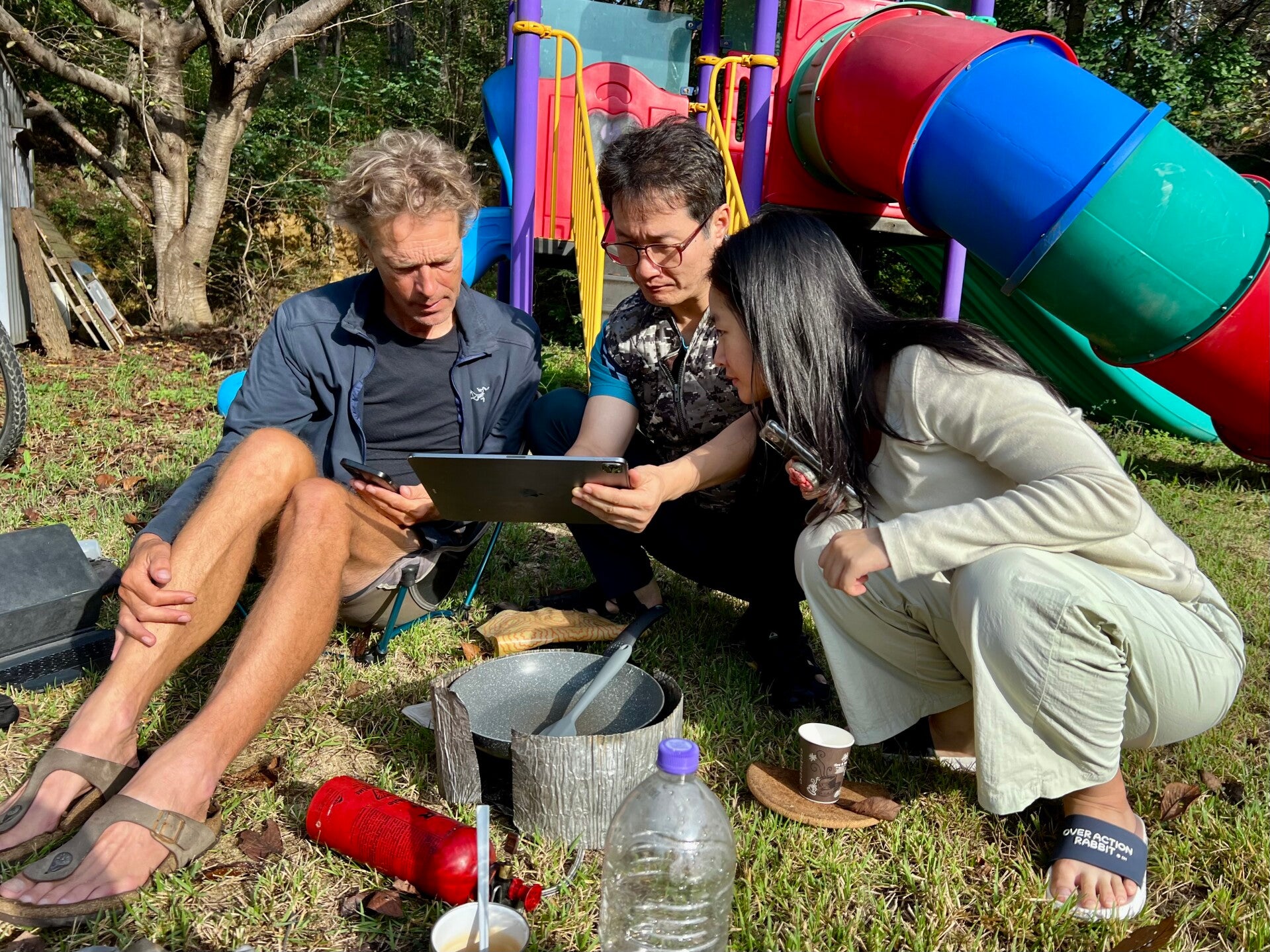 It is quarter to six and still dark. We hear a few cars stop nearby. We hear women's voices, older women, chatting. Then we hear two of them climbing the steps to our gazebo, sitting down on the bench, their feet against the tent. And chatting! Around six o'clock, the ladies leave and the chatter stops. When we open the tent zip at seven o'clock, we see 15 women picking peppers in the field next to us. So that was the commotion! We make coffee. A small lorry arrives and stops next to us. A man and a woman get out and breakfast for the ladies is taken from the back. When the ladies are eating their noodles, the man comes over to us and says we should join them for dinner. I like the idea and sit down among the old ladies. I am given a bowl of noodles with courgettes. It is chilly and extremely foggy, but gradually the sun breaks through. Lovely autumn weather. Today's trip involves quite a few metres of elevation gain and it is sometimes steep. Before the final climb, we have a yoghurt. Halfway down the descent, we turn onto a small road. We find a flat parking area and ask the people at the house next door if we can pitch our tent there. Two men and a woman walk with us. 'No, not too close to the water, there are snakes there. Even better, under the canopy of the house next door, which is empty. But it's tea time, would you like to join us? We walk with them and are given a short tour of the ovens of the learned, artistic, meditating artist. We walk to the back of the kiln room where the river flows and a beautiful idyllic arbour stands. We have to take off our shoes and enter the Japanese-style living room through the sliding door. On one side of the room, the wall is a kind of display case for ceramic cups and teapots. In front of the windows is a sliding panel of thin wooden slats covered with rice paper. We sit on small cushions on the floor at a low table, a halved tree trunk.The man makes a whole ritual out of making tea, pouring hot water over the teapot and back into the teapot again. He tells us that it is expensive tea, where it is not the taste but the strength that is important. We are given a kind of bapao bun with black bean filling and roasted chestnuts. They ask us all sorts of questions about our trip. Wen asks if he also sells his ceramics. No, says the man, I stopped doing that three years ago. The tea, which is served in very small cups, is getting stronger and stronger. We say we'd better pitch our tent before it gets dark. But we have to wait a moment because more chestnuts are on their way. We show our gratitude. They bow with their hands folded. We are given business cards by the men, learned professors affiliated with the university who studied for 30 years. They are 70 and 71 years old and look at least ten years younger. Quite different from the chattering pepper pickers. We pitch the tent under the canopy of the house and reflect on everything that has happened to us today...