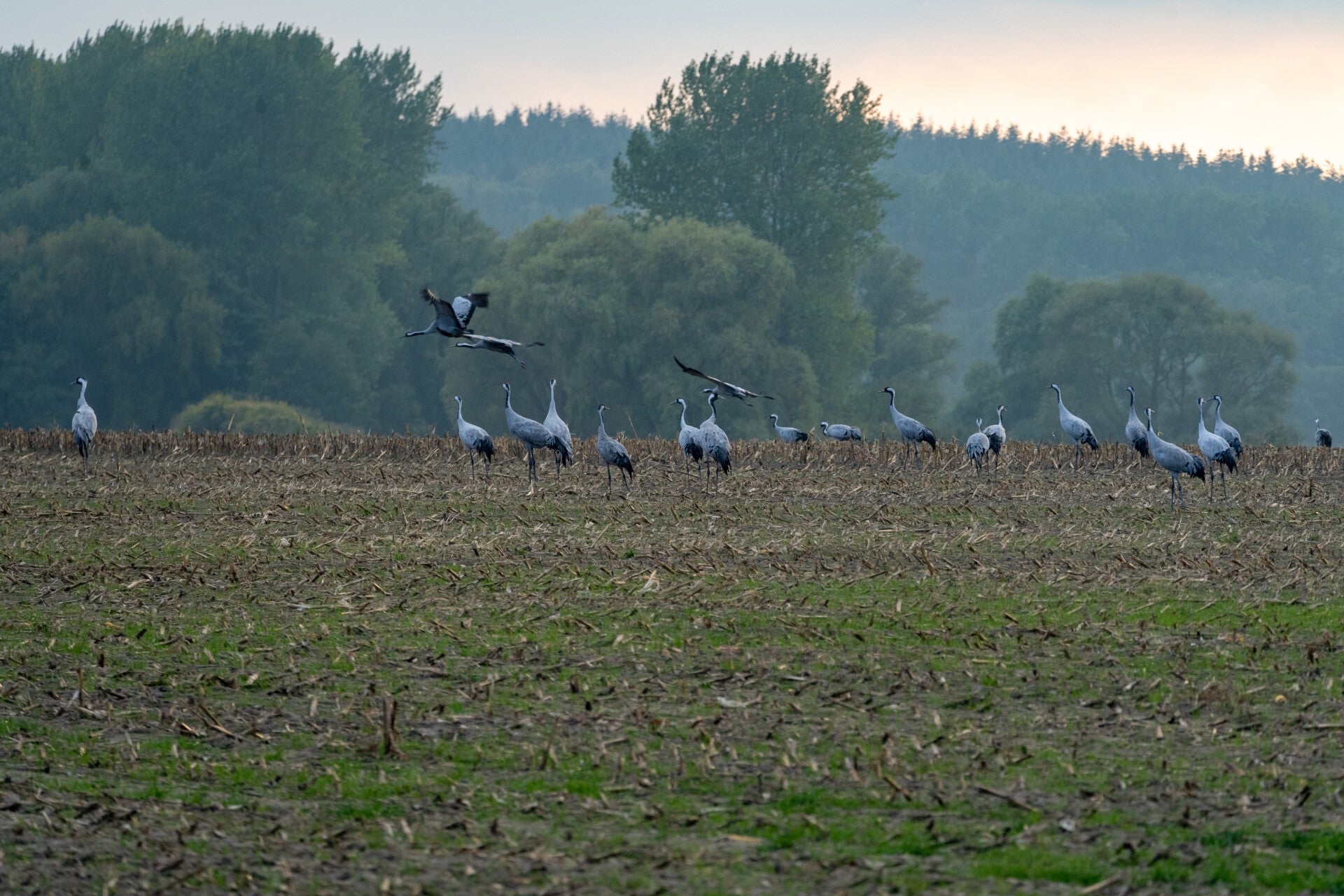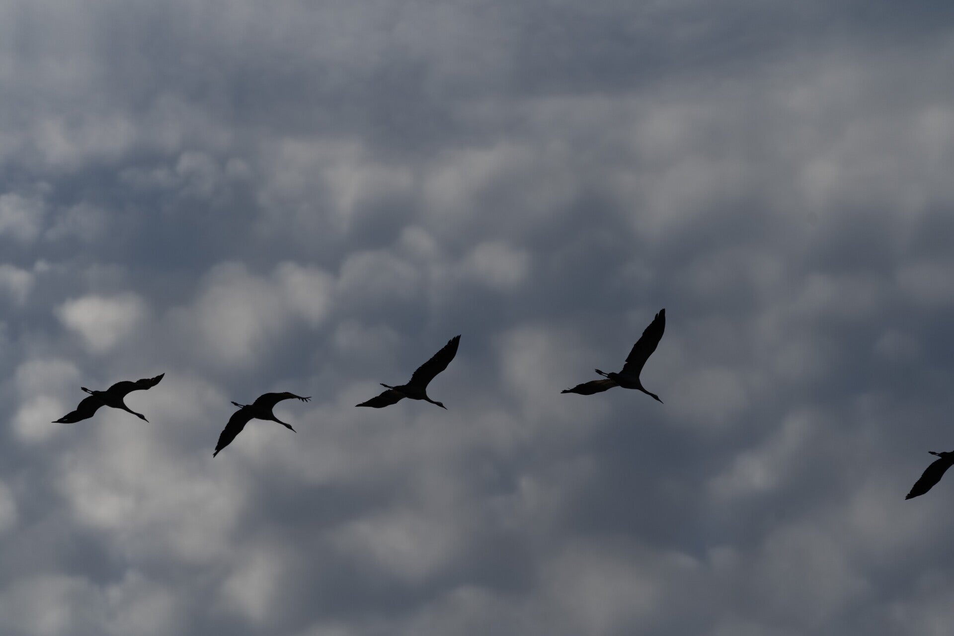 Hier maken we ook kennis met kraanvogels. Enorm grote vogels. Bij zonsopkomst vliegen ze al trompetterend in v-formatie over ons heen naar hun foerageergebied. Bij zonsondergang vliegen ze al trompetterend terug naar hun pleisterplaats. Ze verzamelen zich met duizenden om het goede weer af te wachten om zich door de wind mee te laten voeren naar Spanje om te overwinteren.